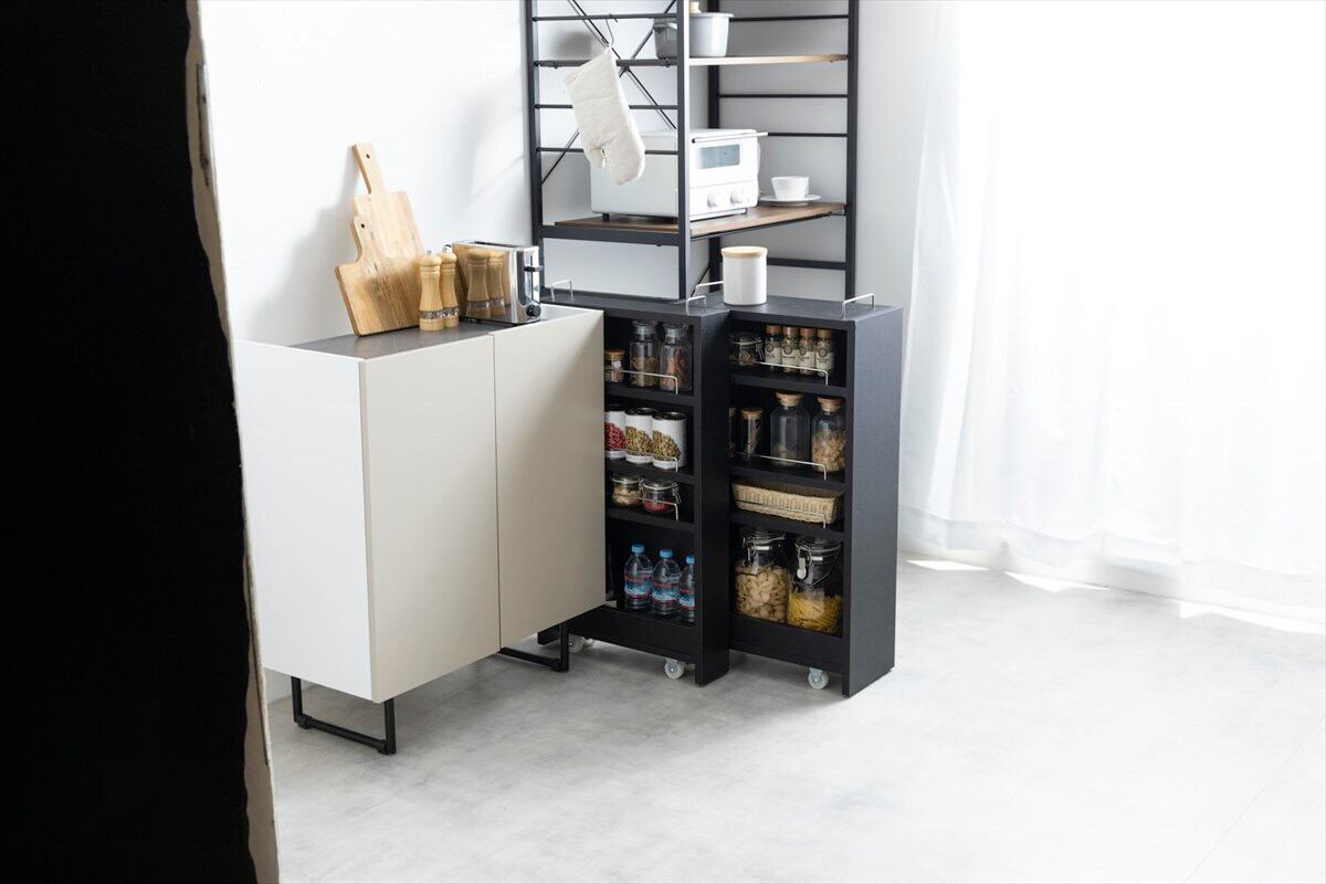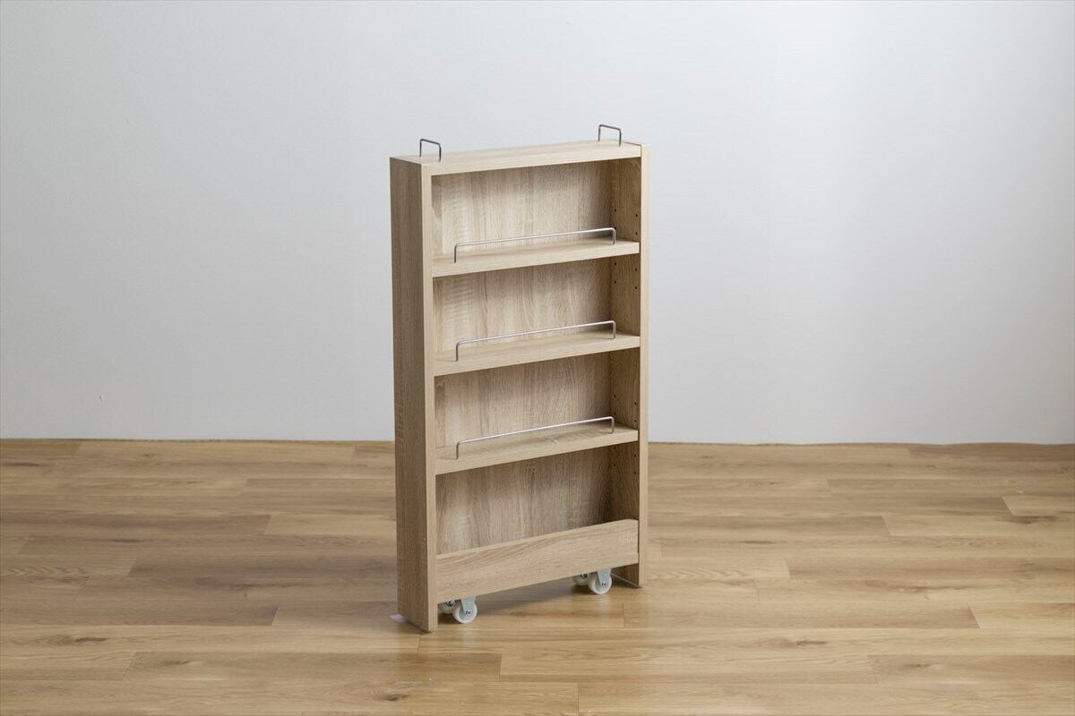 スリムながら、最大で5段の棚を備えており、調味料や本、雑貨などを効率よく整理整頓できます。オープンなデザインなので、必要なものが一目で分かり、出し入れもスムーズです。限られたスペースを有効活用できる、この隙間収納ラックで快適な生活をサポートします。
