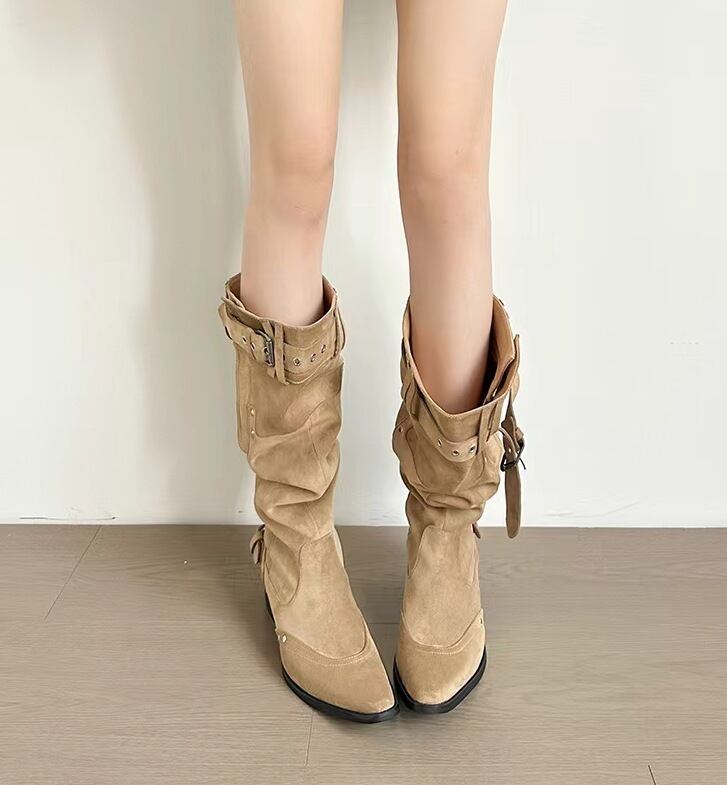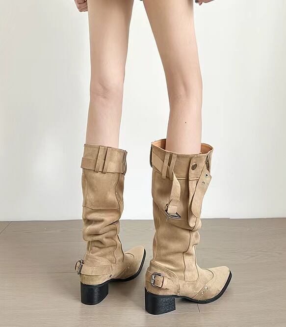 2025 AW カーキ 尖りトウ ブロックヒール レギンス風 ひだ加工 膝上ブーツ