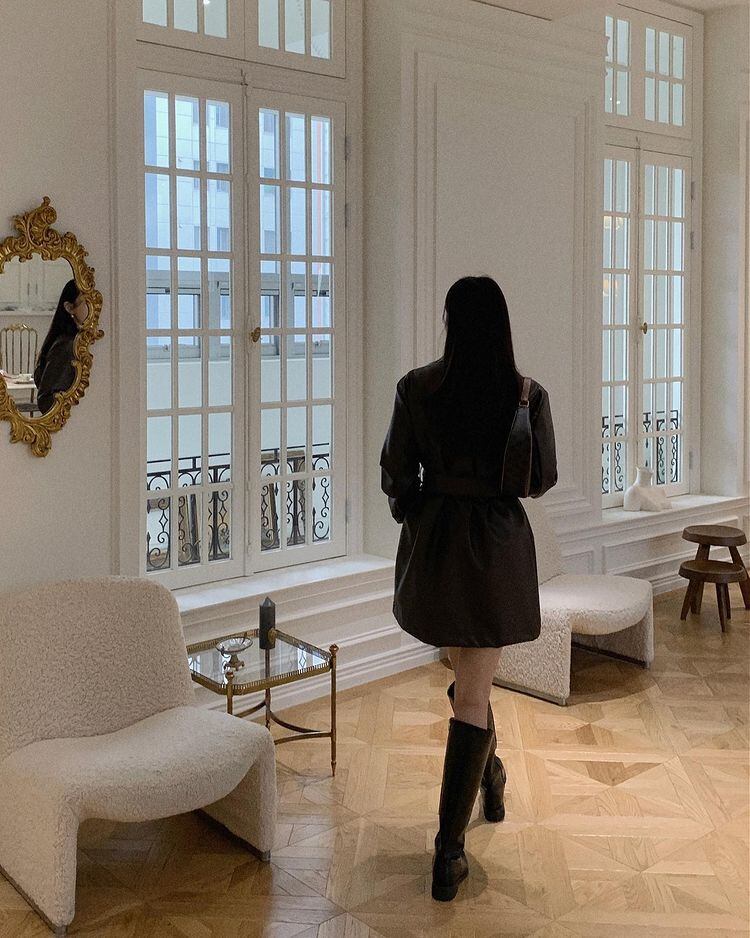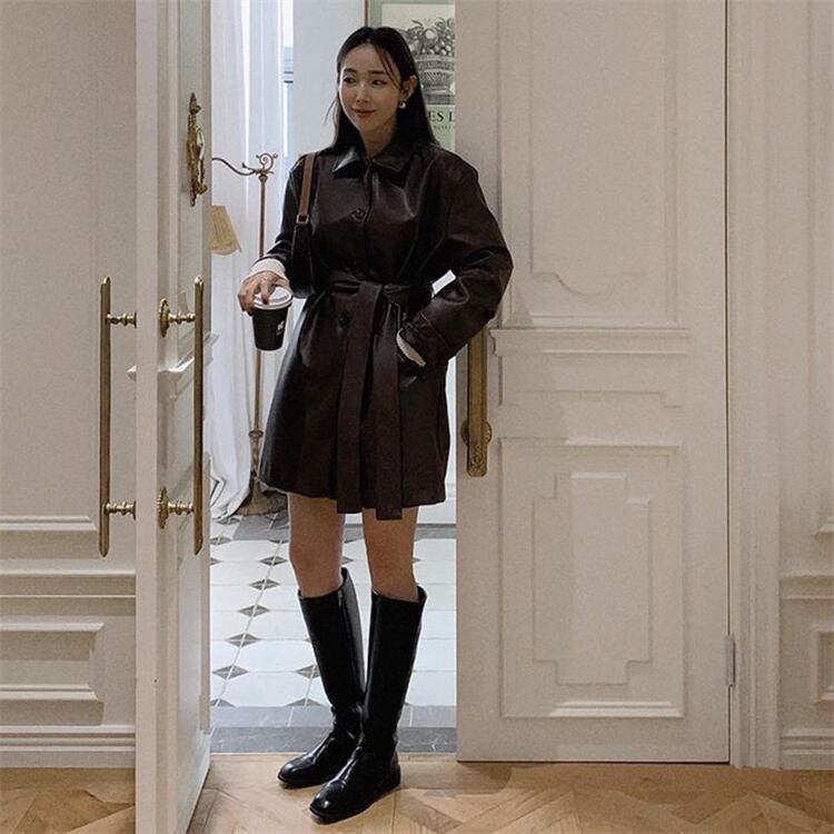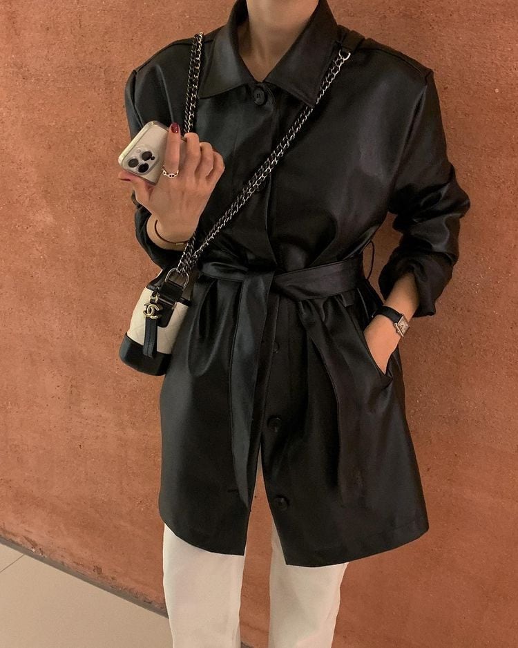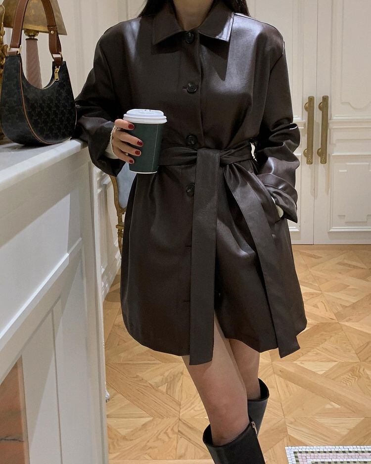 2025オータム ウインドコート レザー素材 ウエスト調整 通勤用