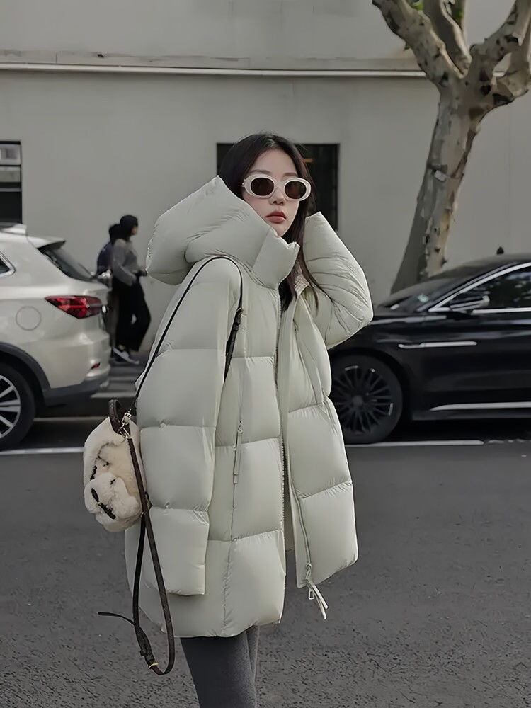 このパフコートは、ミッドロング丈で着こなしやすく、リラックスしたシルエットが体型を選ばず、どんなスタイルにもマッチします。快適な着心地で、寒い季節もお出かけを楽しむことができます。